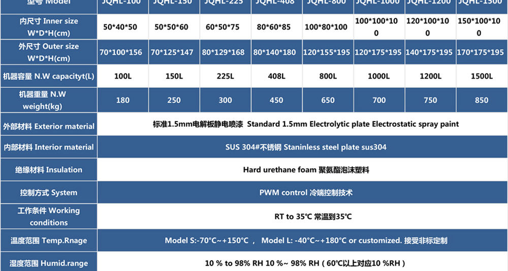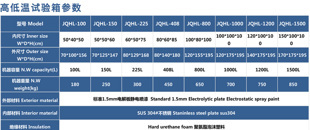 用途:高低溫試驗(yàn)箱 JQHL-100L-1000L為電子、電工、儀表、零部件、材料等試驗(yàn)樣品進(jìn)行高溫、低溫、或者恒定試驗(yàn)的溫度環(huán)境變化后的參數(shù)及性能測(cè)試。適用于汽車(chē)、航空、高校,專業(yè)實(shí)驗(yàn)室研究開(kāi)發(fā)