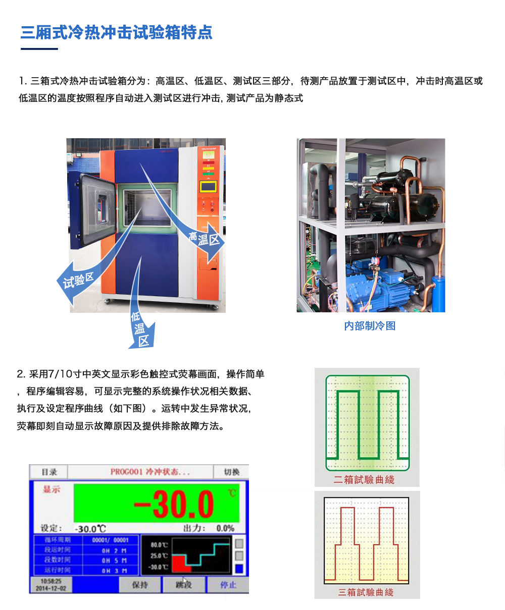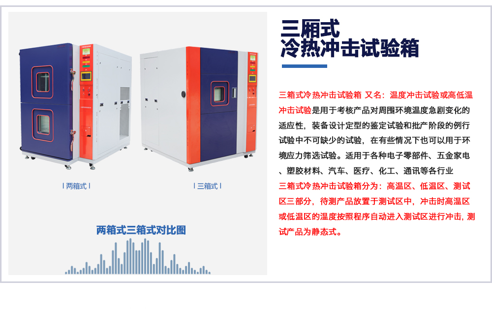 用途:三箱式冷熱沖擊試驗箱又名溫度沖擊試驗或高低溫沖擊試驗是用于考核產品對周圍環境溫度急劇變化的適應性,裝備設計定型的鑒定試驗和批產階段的例行試驗中不可缺少的試驗,在有