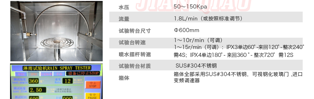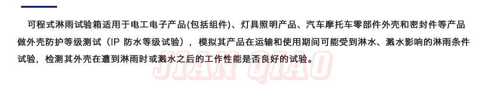 用途:可程式淋雨試驗(yàn)箱適用于電工電子產(chǎn)品(包括組件)、燈具照明產(chǎn)品、汽車(chē)摩托車(chē)零部件外殼和密封件等產(chǎn)品做外殼防護(hù)等級(jí)測(cè)試(IP 防水等級(jí)試驗(yàn)),模擬其產(chǎn)品在運(yùn)輸和使用期間可能受