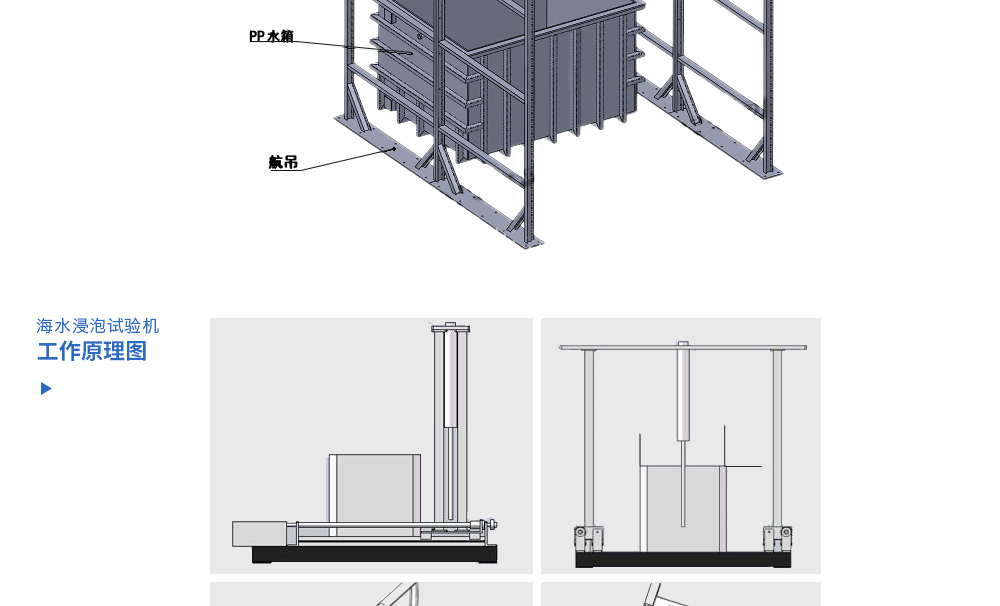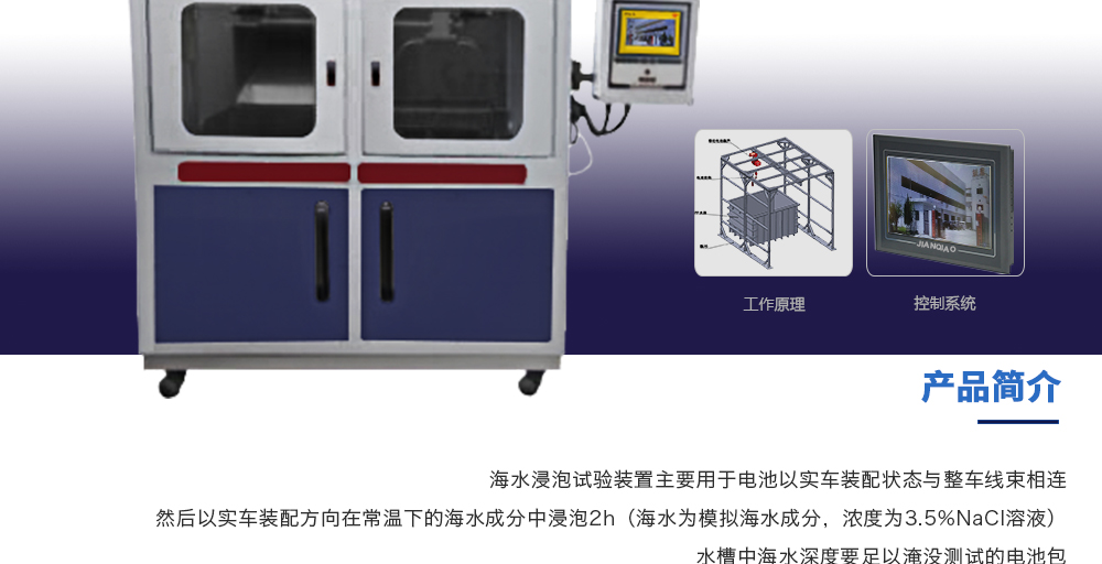 用途:海水浸泡試驗裝置主要用于電池以實車裝配狀態與整車線束相連然后以實車裝配方向在常溫下的海水成分中浸泡2h(海水為模擬海水成分,濃度為3.5%NaCl溶液)水槽中海水深度要足以淹