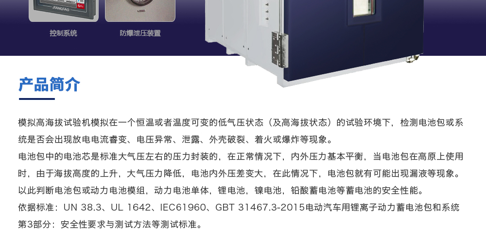 用途:模擬高海拔試驗(yàn)機(jī)模擬在一個(gè)恒溫或者溫度可變的低氣壓狀態(tài)(及高海拔狀態(tài))的試驗(yàn)環(huán)境下,檢測(cè)電池包或系統(tǒng)是否會(huì)出現(xiàn)放電電流睿變、電壓異常、泄露、外殼破裂、著火或爆炸等