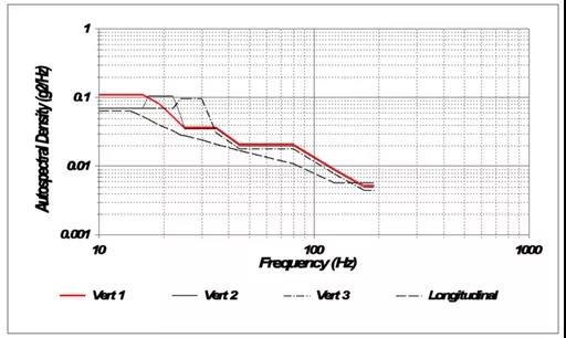 SAE J2380標準振動目標譜基于實際道路測量數(shù)據(jù),旨在模擬行駛10萬英里對電池組和模塊的影響。該標準要求一系列隨機振動目標譜應用于三個垂直軸,試驗時長從9分鐘到38小時不等。