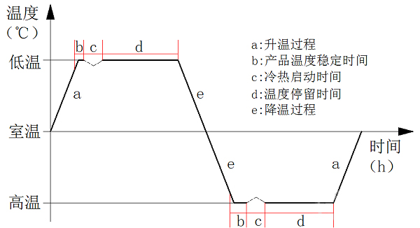 熱循環(huán)試驗(yàn)是一種利用高低溫交變濕熱試驗(yàn)箱對(duì)試驗(yàn)產(chǎn)品進(jìn)行的預(yù)設(shè)高低溫交替的應(yīng)力考核,用以驗(yàn)證材料和產(chǎn)品是否達(dá)到在研發(fā)、設(shè)計(jì)、制造中預(yù)期的質(zhì)量目標(biāo)的一類可靠性試驗(yàn)。通過(guò)大溫變速率可暴露產(chǎn)品潛在的材料與性能缺陷,經(jīng)過(guò)不斷地質(zhì)量改進(jìn),達(dá)到可靠性提升的目的。航天單機(jī)類產(chǎn)品一次熱循環(huán)示意圖見(jiàn)下圖1所示。