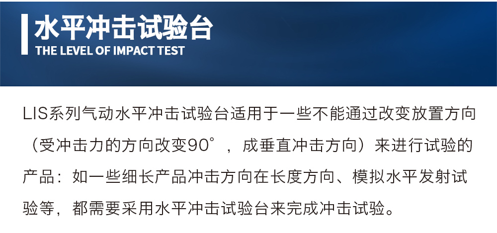 用途:LIS系列氣動水平沖擊試驗臺適用于一些不能通過改變放置方向(受沖擊力的方向改變90°,成垂直沖擊方向)來進行試驗的產品:如一些細長產品沖擊方向在長度方向、模擬水平發射試驗等,都需要采用水平沖擊試驗臺來完成沖擊試驗